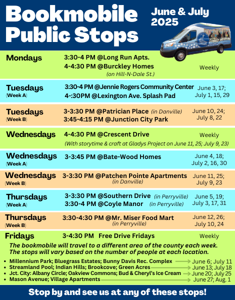 The Bookmobile travels on a predetermined schedule to neighborhoods and communities throughout Boyle County. Any patron is welcome to use the Bookmobile at any stop that it makes. The items circulated on the Bookmobile include books, magazines, and DVDs. Each of these has a two-week check-out period that aligns with the bi-weekly route that the Bookmobile follows. To see all of the stops, check out our calendar!